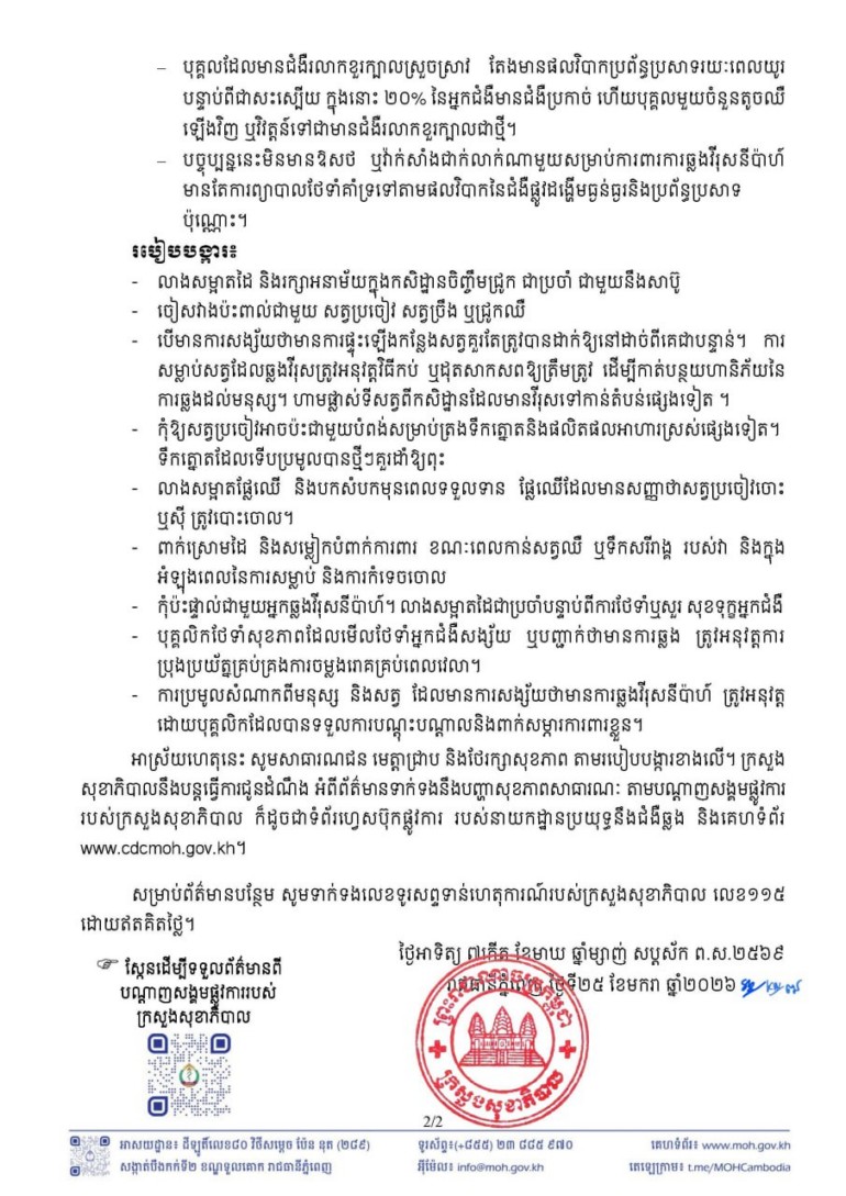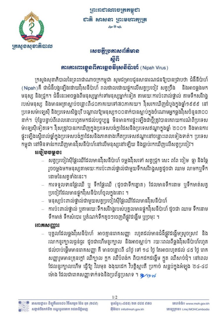 ពេញ ៖ នាថ្ងៃទី ២៥ ខែមករា ឆ្នាំ ២០២៥ ក្រសួងសុខាភិបាលនៃព្រះរាជាណាចក្រកម្ពុជា បានចេញសេចក្តីប្រកាសព័ត៌មាន ជម្រាបជូនសាធារណជន អំពីវីរុសនីប៉ាហ៍ (Nipah Virus) និងវិធីការពារខ្លួន សម្រាប់បងប្អូនប្រជាពលរដ្ឋជាទូទៅ ។